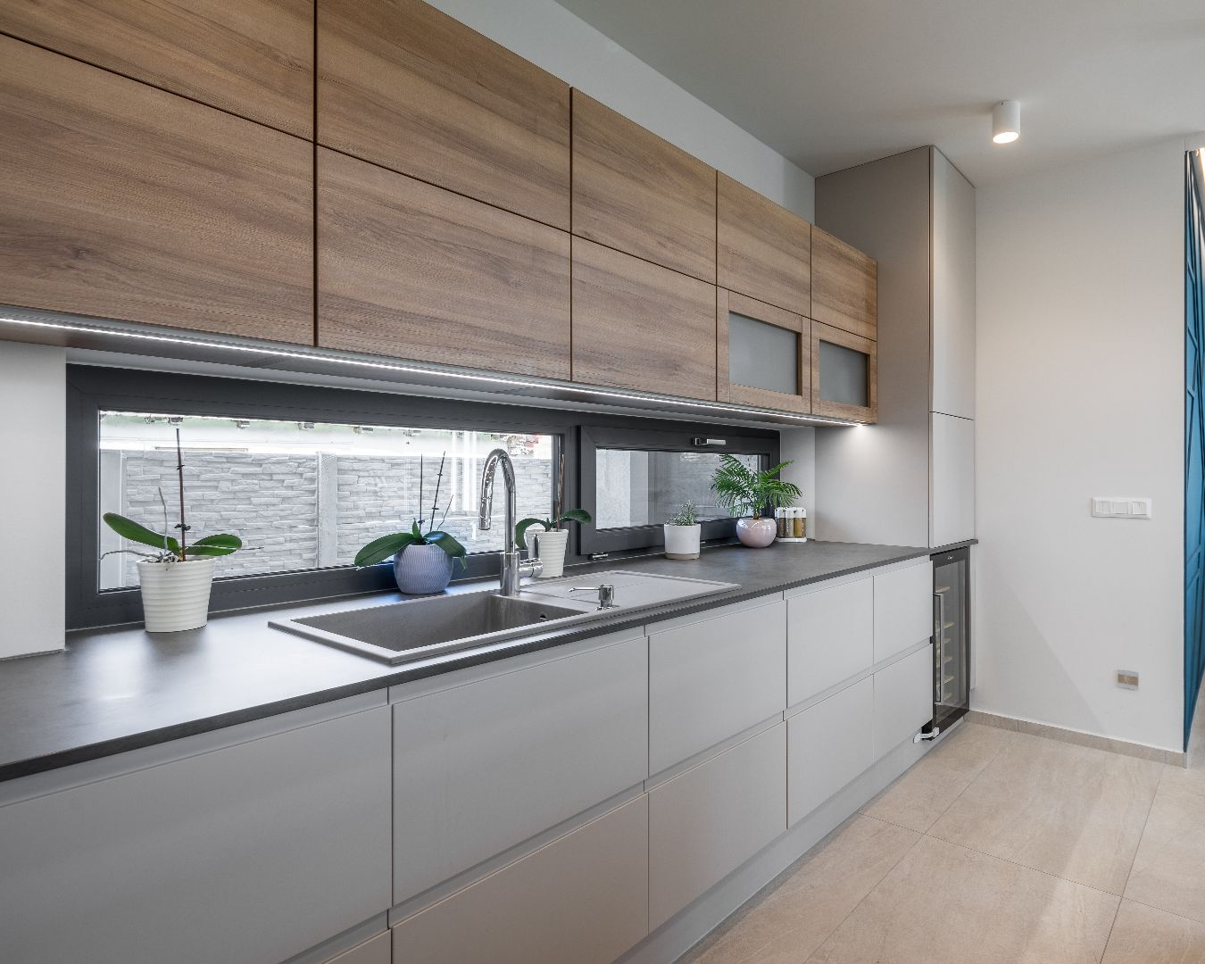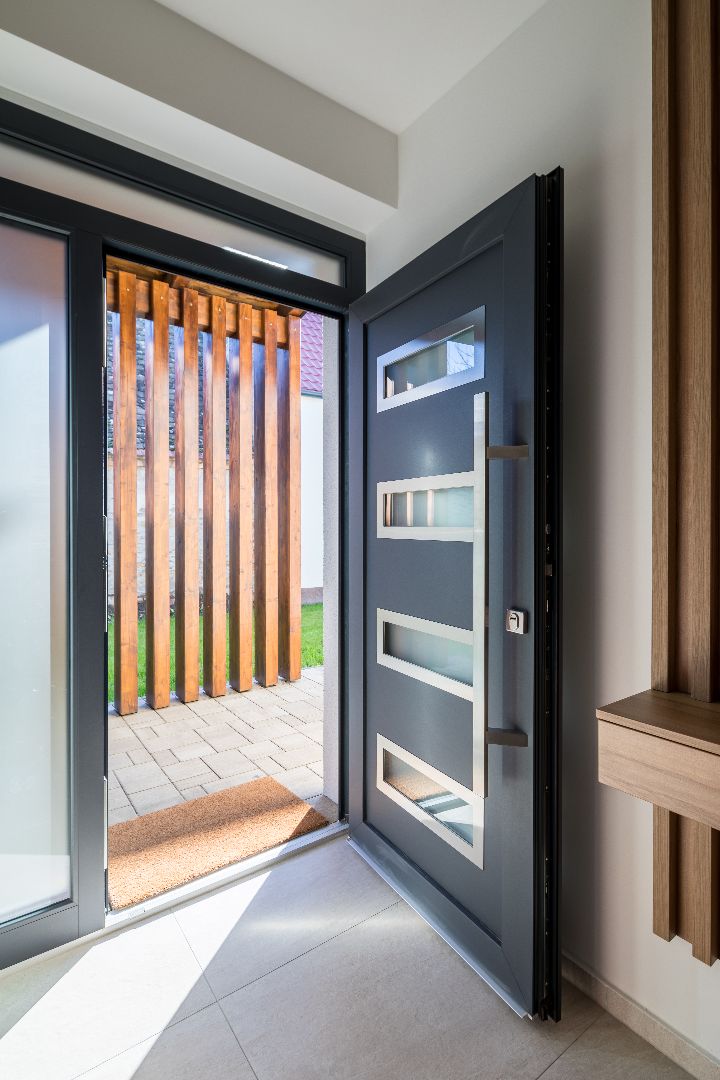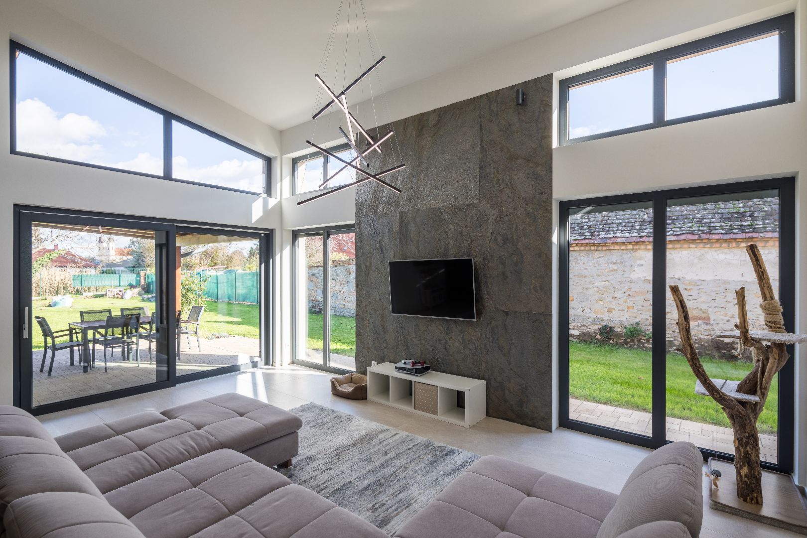 Széles panorámát nyújtó alumínium nyílászárókat és automata redőnyöket telepítettünk. A nagy üvegfelületek luxus-érzetet keltenek azáltal, hogy több fényt engednek be a belső térbe és közelebb hozzák a természetet, így világosabb és tágasabb hatást keltenek.
