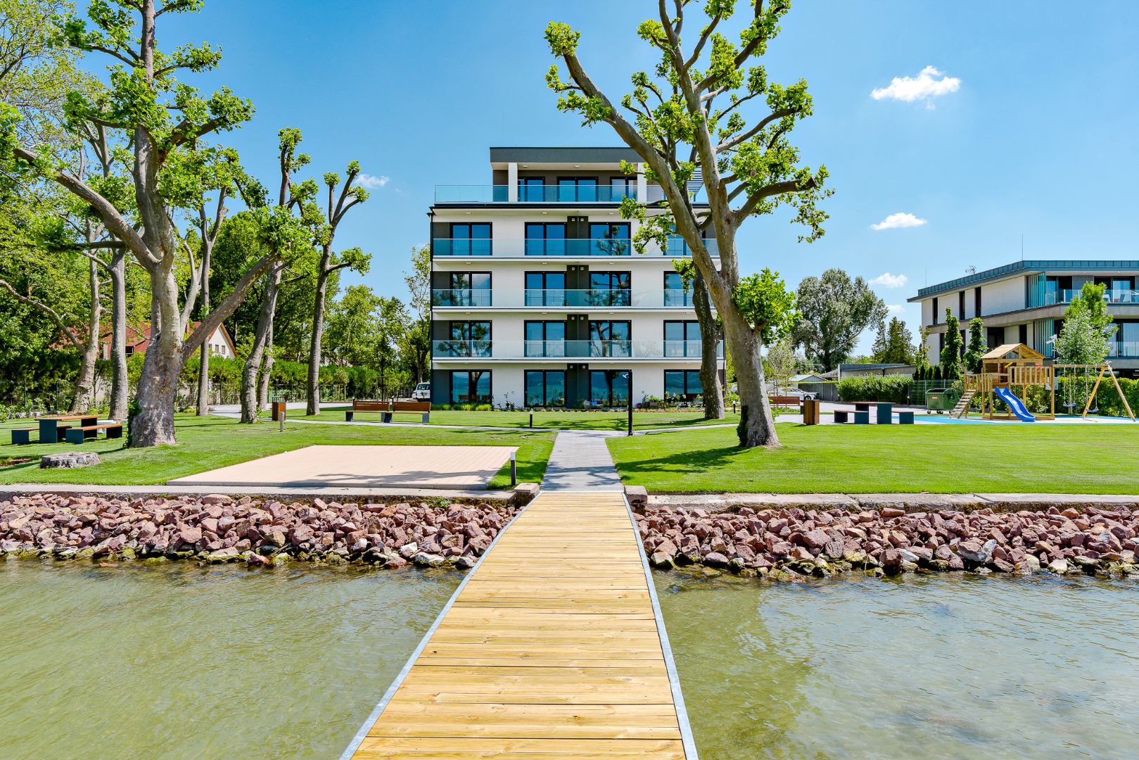 A látványos vízparti panorámát és természetközeli hangulatot kiemelkedő hő- és hangtechnikai jellemzőkkel bíró PVC és alumínium nyílászáróink biztosítják a balatonboglári társasházban.